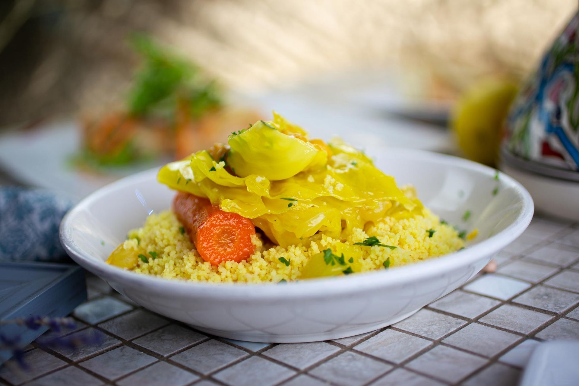 Delicious fluffy North African dish served with roasted vegetables.